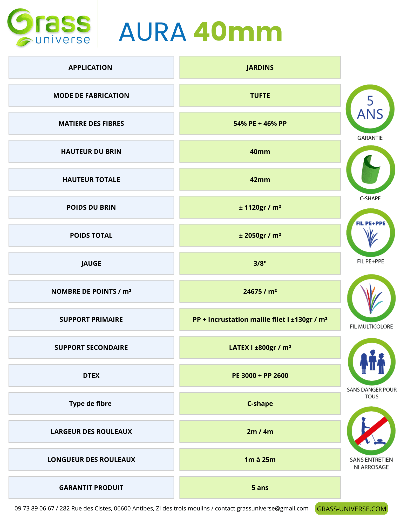 Le gazon synthétique AURA 40mm est parfait pour un aménagement paysager de haute qualité. Ses brins doux et confortables au toucher offrent une sensation agréable, idéale pour les espaces de détente et les zones de passage. Très résistant, il convient à tout type d’usage extérieur. Ses teintes chaudes aux différentes nuances de vert apportent un rendu naturel et élégant, proche d’un gazon naturel dense. Le gazon synthétique AURA 40mm garantit un extérieur esthétique, durable et sans contrainte d’entretien.