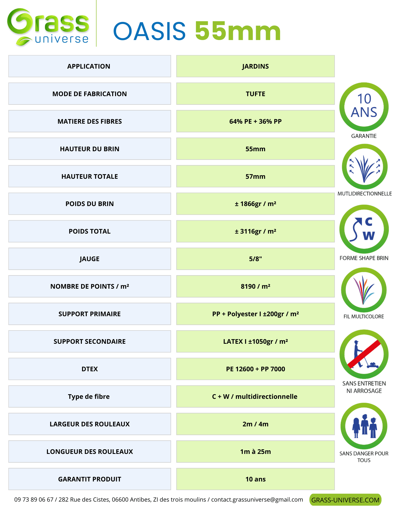 Le gazon synthétique OASIS 55mm est un modèle haut de gamme et durable, pensé pour offrir un rendu ultra réaliste. Ses différentes teintes de vert, légèrement jaunies et claires, reproduisent fidèlement l’aspect d’un gazon naturel exposé au soleil. Équipé de brins multidirectionnels en forme de C, il offre une excellente résistance à l’écrasement et une tenue optimale dans le temps. Sa haute densité, combinant de nombreux brins courts et frisés avec des brins longs, crée un rendu visuel parfait, dense et naturel peu importe l’angle de vue. Le gazon synthétique OASIS 55mm est idéal pour les projets paysagers exigeants, alliant esthétique, confort et performance.